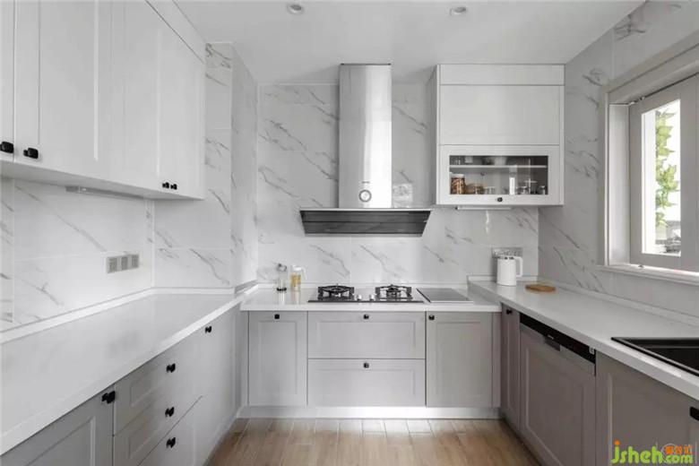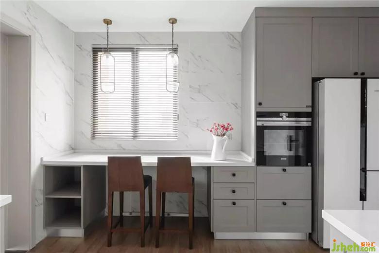 廚房部分以淺色大理石紋理的進(jìn)口瓷磚貼面,既能讓充滿生活氣息的空間顯得干凈清透,其本身也獨(dú)具易清潔好打理的特性。在柜門的顏色上做了與整體空間的深淺過度,讓淺色的空間可鹽可甜。