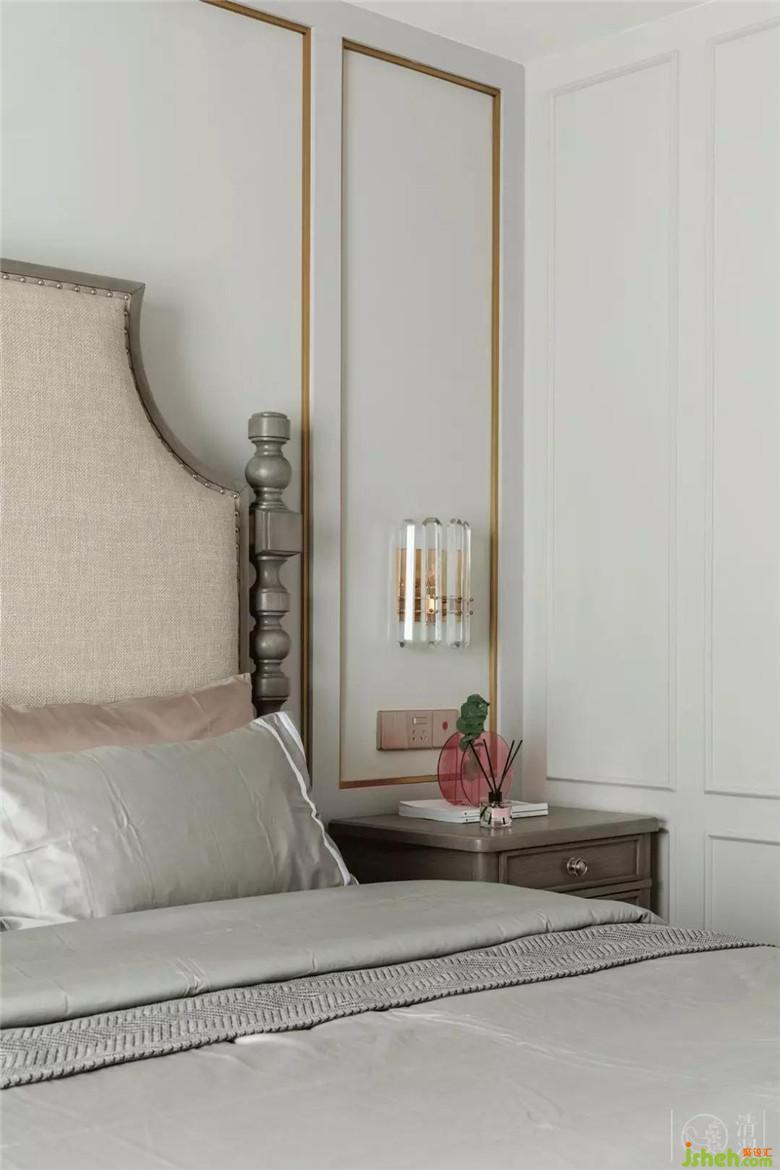 整個(gè)主臥室素雅安靜,局部使用了護(hù)墻板加金屬線條,增加空間的精致感。