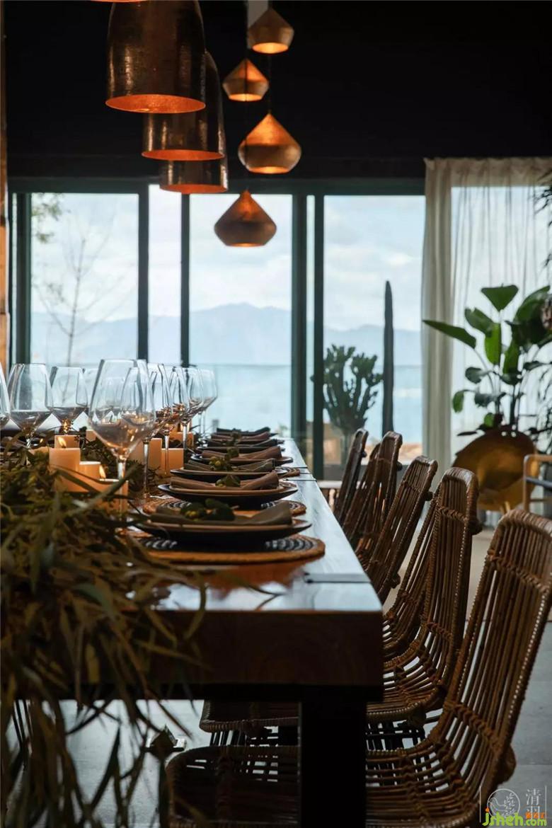 餐廳,同樣是開放式,并且采用了西式長條桌,沒有做單獨的分桌。一來方便聚會,二來也給陌生的旅人間創(chuàng)造更多的可能。