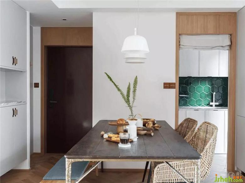 進門的右側(cè)是餐廳,左側(cè)的墻面如果僅僅用作裝飾過于浪費,我們用白色到頂柜體做了收納空間,鞋帽包服均可囊括其中,清爽的視覺效果也能減少入戶相對狹小空間的壓迫感。