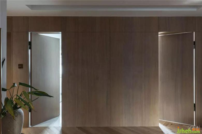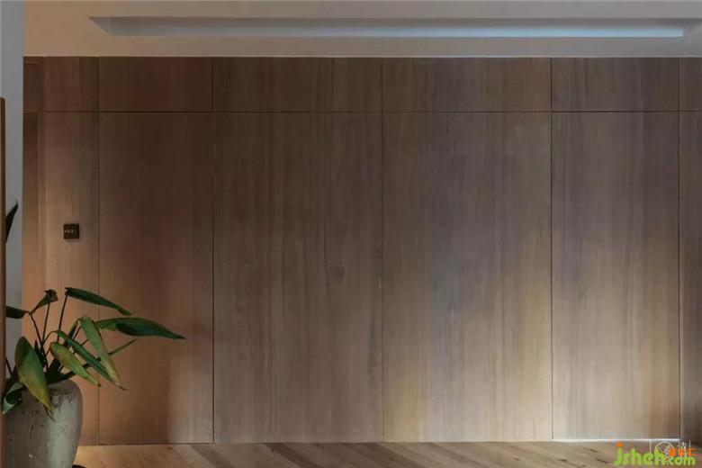我們以到頂?shù)脑旧b飾面板上墻,巧妙地將次衛(wèi)與通向陽(yáng)臺(tái)房間的墻面做成隱形墻,關(guān)上門(mén)即刻化身超大投影幕布背景墻。