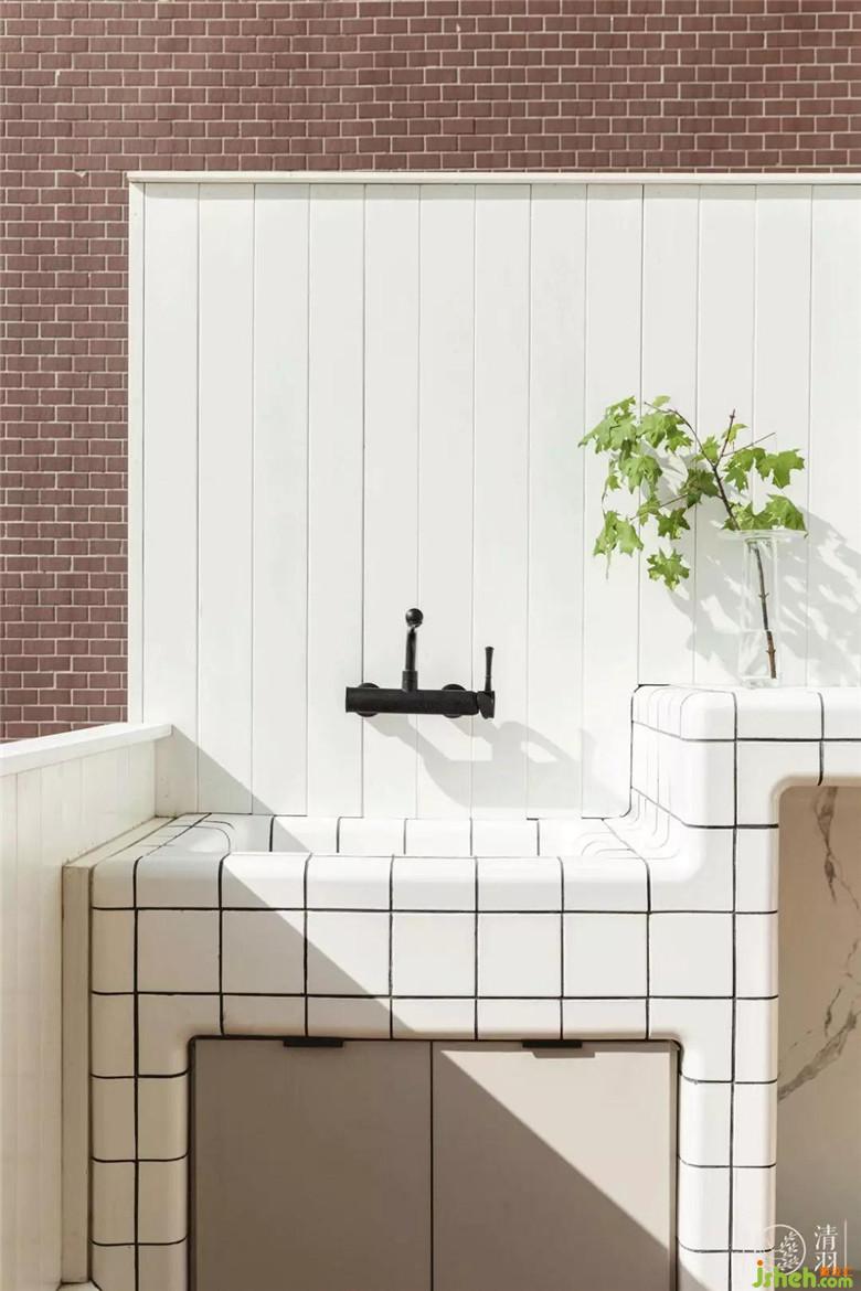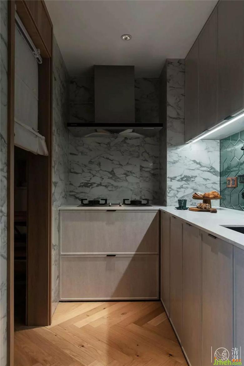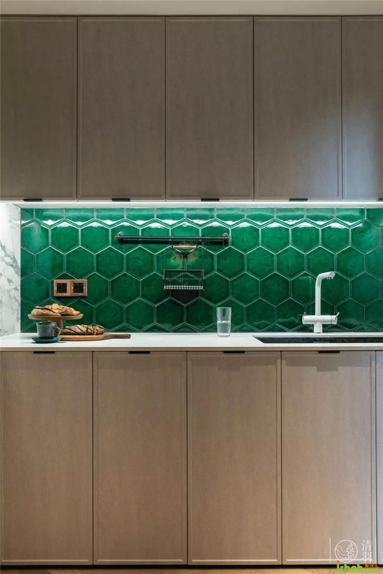 廚房的空間較小,用綠色的蜂巢瓷磚為布紋材質(zhì)的櫥柜平添一份生機,輕輕帶出熱帶氣息。吊柜下的燈作為切洗的主要光源,讓人間煙火氣在這里散發(fā)出一絲文藝卻不矯情的精致。門的部分為了節(jié)省空間,以亞麻的簾子替代,與到頂?shù)哪举|(zhì)門框和諧的釋放出自然美感。