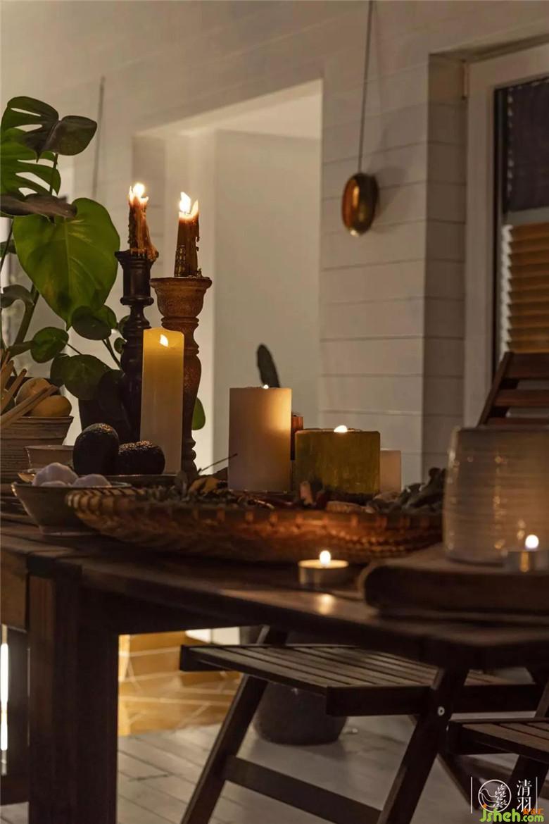 半開放的玻璃頂,擋風擋雨,引入陽光和自然之氣,墻面利用白色深度碳化木,折射出光的熱烈,潔凈而溫情;深度碳化的木地臺上,陶土罐里的仙人掌、尤加利、橄欖枝條、龜背竹向光而生,遠方的叢林也不過這樣吧。