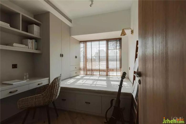 次臥在小朋友長(zhǎng)大之前,它更多的功能可能就在于偶爾充當(dāng)客房,偶爾充當(dāng)辦公空間,偶爾充當(dāng)儲(chǔ)藏間,于是書架、環(huán)繞式收納柜、箱式帶收納功能的榻榻米一應(yīng)滿足所有需求。