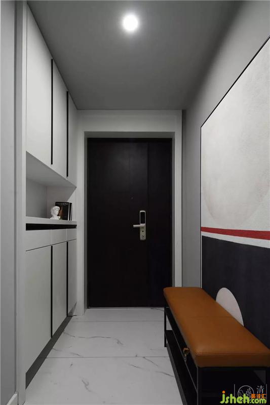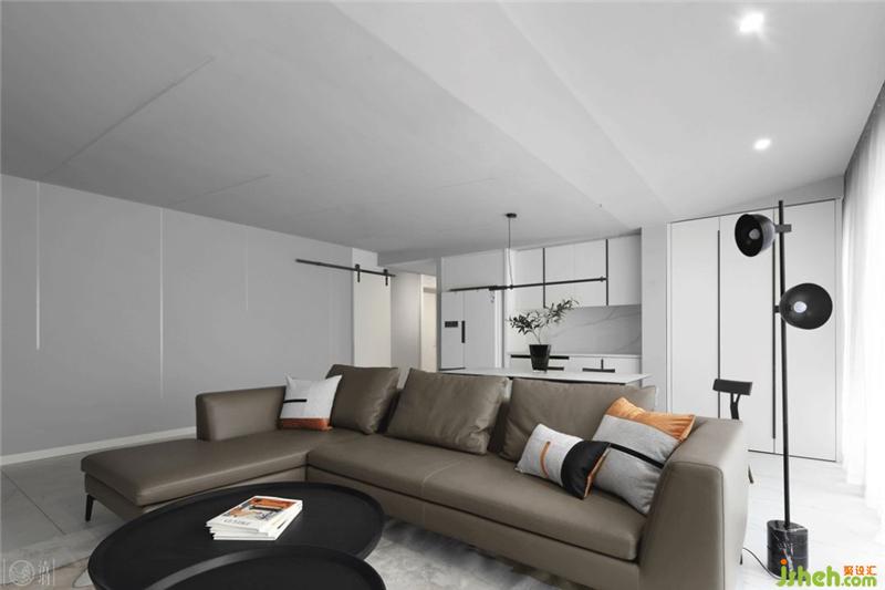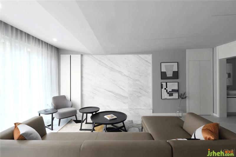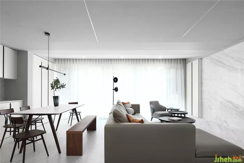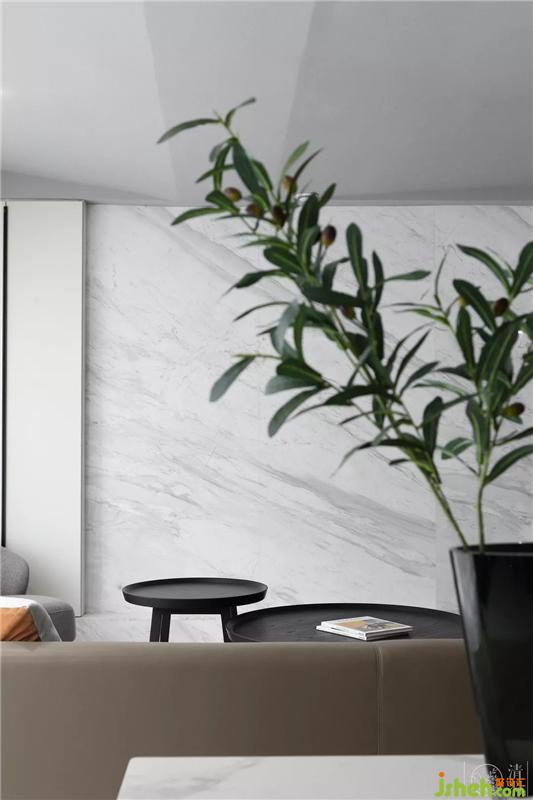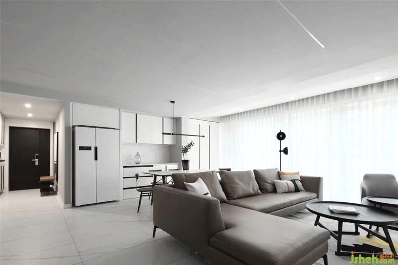 通過(guò)玄關(guān)進(jìn)入室內(nèi)空間向右是廚房,向左是客廳??蛷d整體空間以白色主色調(diào)。灰色墻漆、白色大理石、白色系家具都圍繞它展開(kāi)。以淺灰色沙發(fā)、灰色電視背景墻為次色調(diào),用白和灰兩大色調(diào),將整個(gè)空間完美切割,打造一個(gè)既簡(jiǎn)潔,又通透的空間。