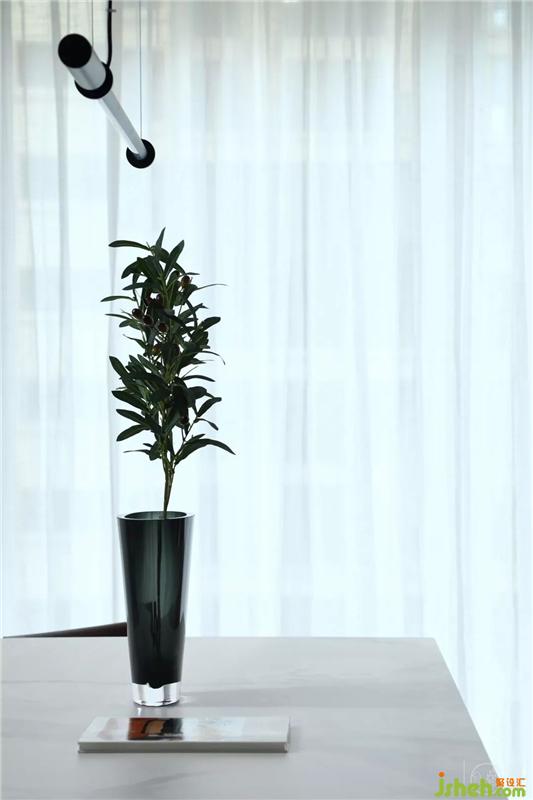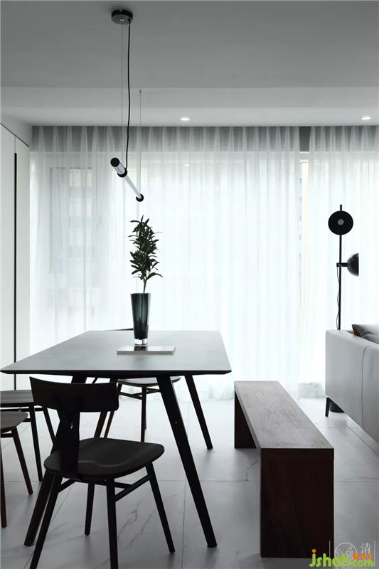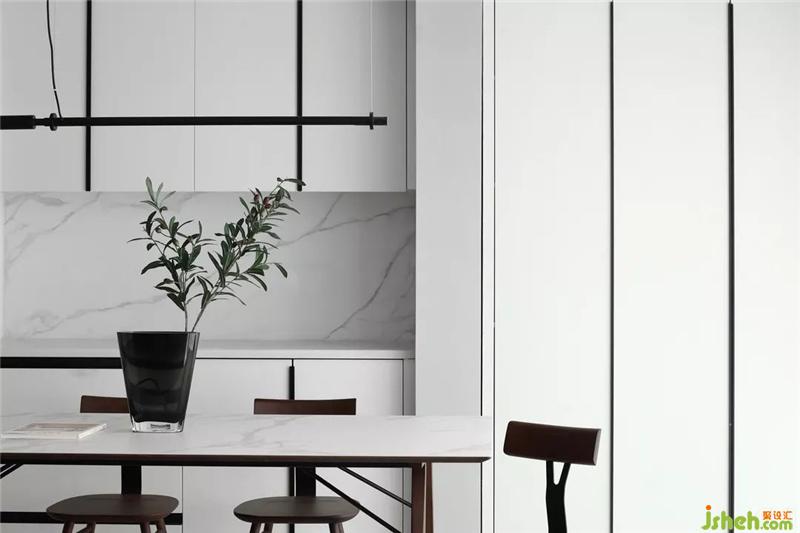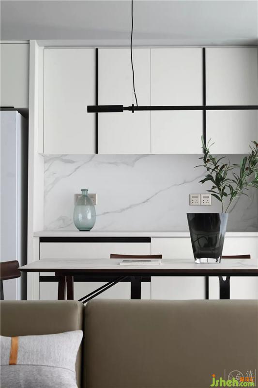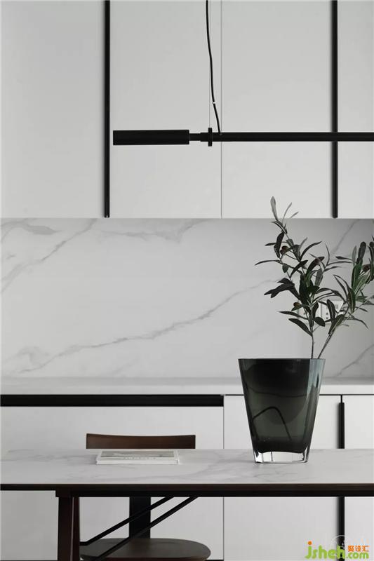 開放式的空間布局,使客廳和餐廳兩個空間之間相互貫通、相互融合。餐廳里我們用白色櫥柜將空間進(jìn)行延伸,用木質(zhì)的餐桌座椅以及家具拉手的黑色線條去緩解了空間里大面積白色帶來的清冷感,也將客廳與餐廳有效的進(jìn)行了融合。
