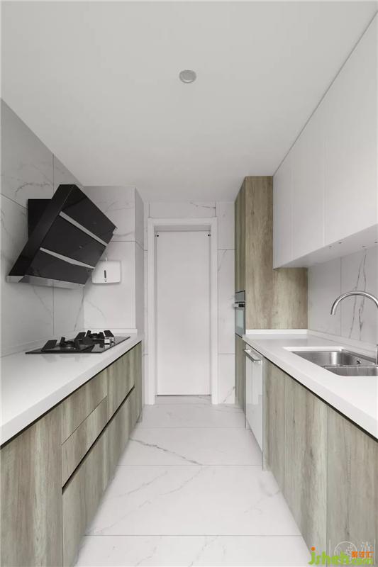 中西文化多種多樣,東方傳統(tǒng)文化與西方現(xiàn)代文化各自獨(dú)立又兼容并蓄。所以在飲食上,考慮到中餐和西餐的做法不一致,廚房的空間有限,我們將中廚區(qū)獨(dú)立設(shè)計,中西廚區(qū)分屬為兩個陣營,中廚區(qū)繼續(xù)沿用客廳風(fēng)格,整體以白色、木色為主,用黑色拉手、黑色家電點(diǎn)綴其間,彰顯著空間簡單大方的空間氛圍,并且在空間兩側(cè)采用一字型的操作臺,有效的將操作空間進(jìn)行了合理劃分,最大限度增加了廚房的收納空間。