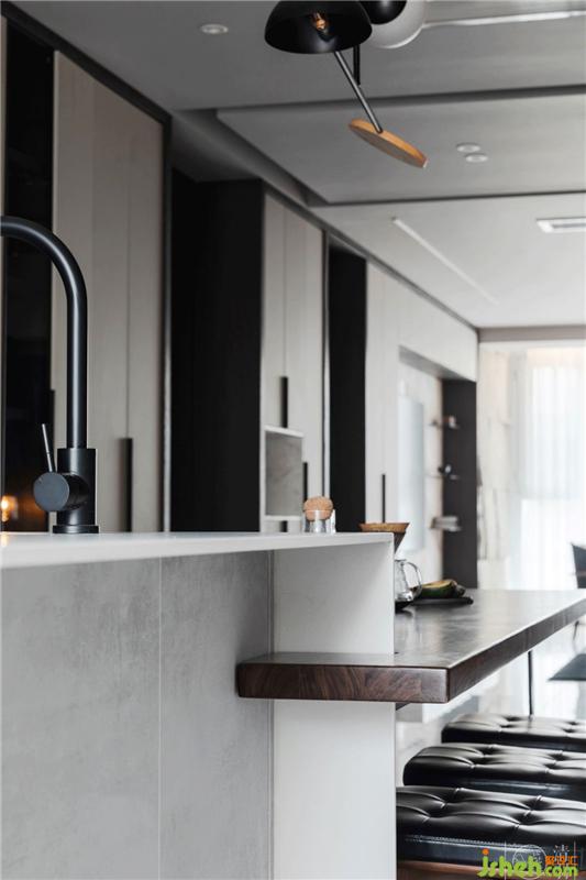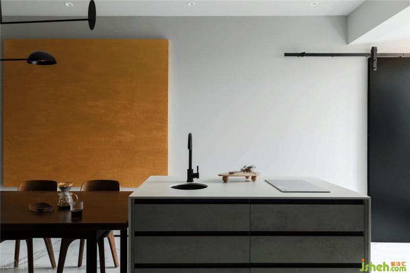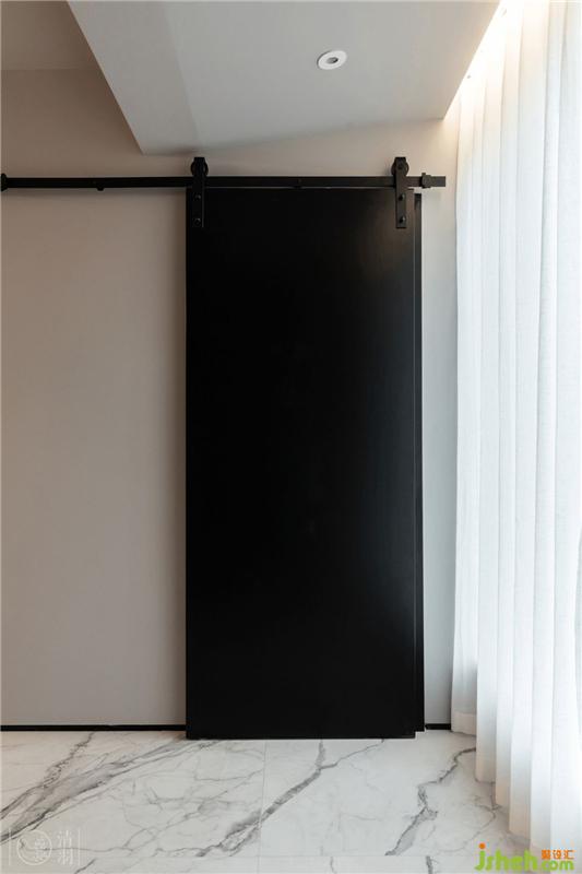 客廳一側(cè)的陽臺采用天然石皮貼面,餐廳一側(cè)因為分隔出了一個設(shè)備間,做了一扇黑色谷倉門。而在相對高密度的住宅群落中,落地窗前用紗幔來兼顧私密性與透光性,搭配飛機頂側(cè)面嵌入的燈條。不同材質(zhì)碰撞出“既雕既琢,復(fù)歸于樸”的感覺,也讓空間氛圍有更多可變性。