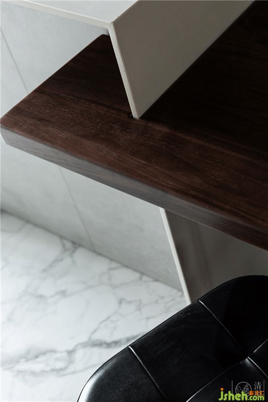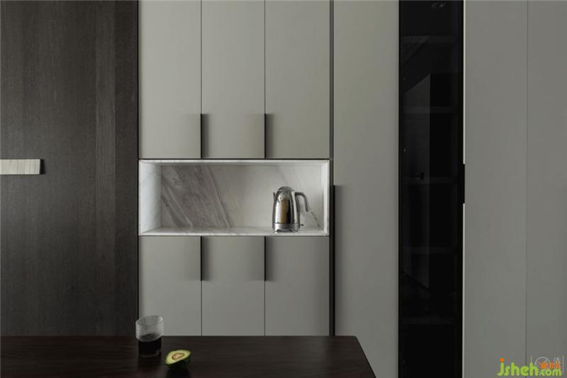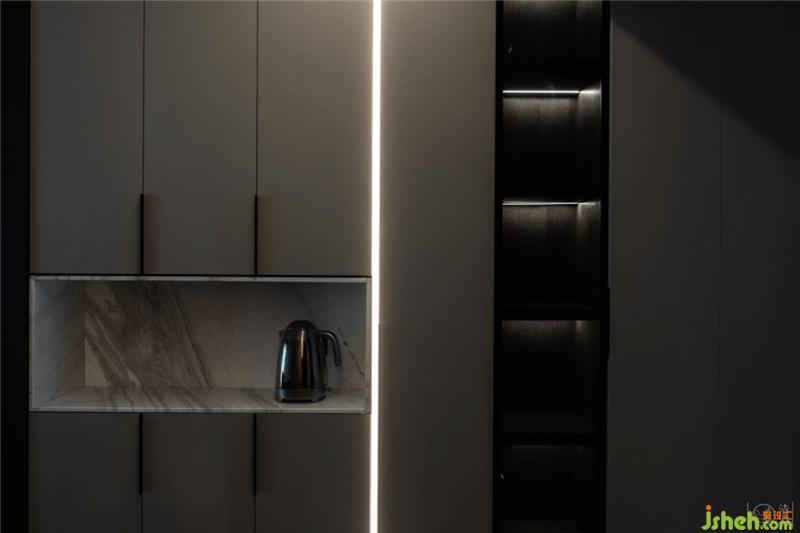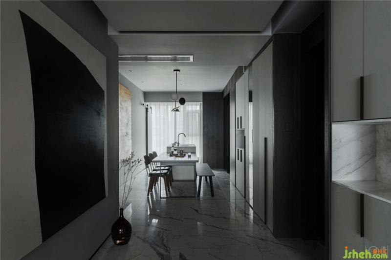 在客廳通往餐廳的走廊里,也就是入戶門的兩側(cè)設(shè)置了兩組儲物柜,并用石材做了開放式的置物盒子。室內(nèi)設(shè)計師