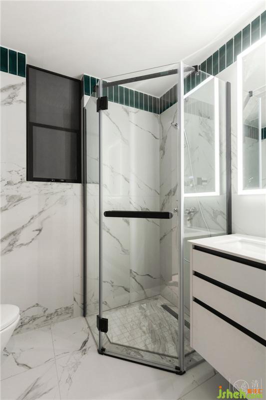 主臥與衛(wèi)生間交接處,再次采用嵌入式銅條做功能空間的分隔,以達(dá)到全屋無高差設(shè)計(jì);淋浴間下沉式地漏;以及三分離式設(shè)計(jì),是我們?yōu)榉蚱迋z準(zhǔn)備的貼心三連。