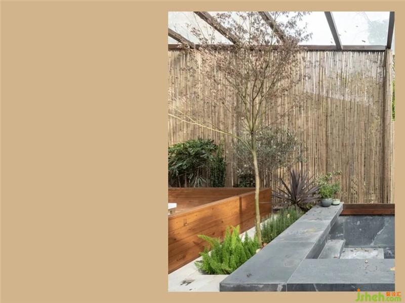 考慮到安全和日后使用的便利,我們對(duì)花園做了半封閉處理。鋼架加隔熱夾膠玻璃對(duì)休閑區(qū)域的遮蓋,既能保證光照的通透也能避免萬一的高空拋物。立面部分以巖板貼面的半墻結(jié)合定制的到頂竹籬笆,兼顧私密性與良好的自然通風(fēng)。并利用階梯、花臺(tái)、座椅的靠背,做出空間的層次感。
