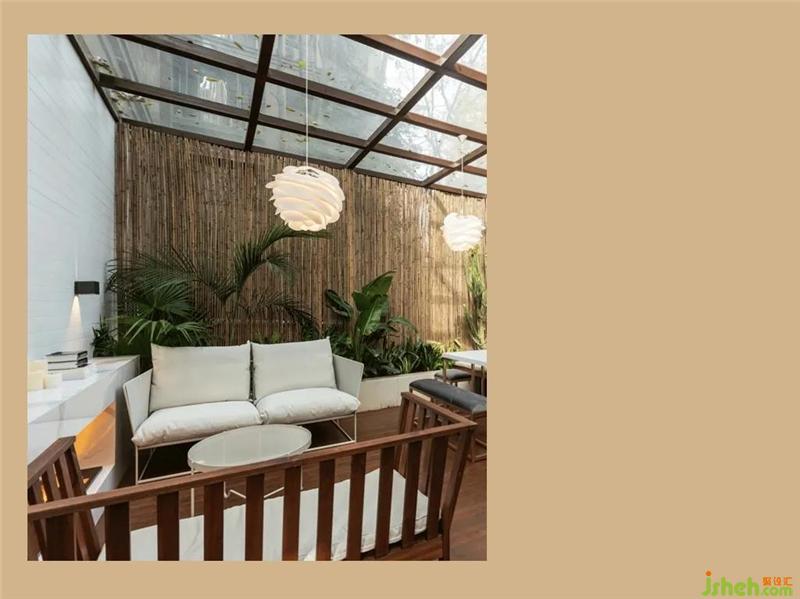 整個(gè)花園設(shè)置了兩個(gè)部分的休息區(qū),靠樓體的墻面用了大面積的深度碳化木刷成簡(jiǎn)單干凈的白色,搭配恣意生長的觀葉綠植、線條簡(jiǎn)潔的木質(zhì)長椅、白灰色的棉麻布藝沙發(fā)和Umage Vita Copenhagen Carmina海浪燈……不知道有沒有能給你海風(fēng)拂面的感覺呢?