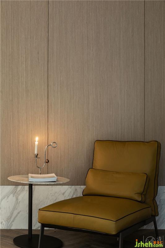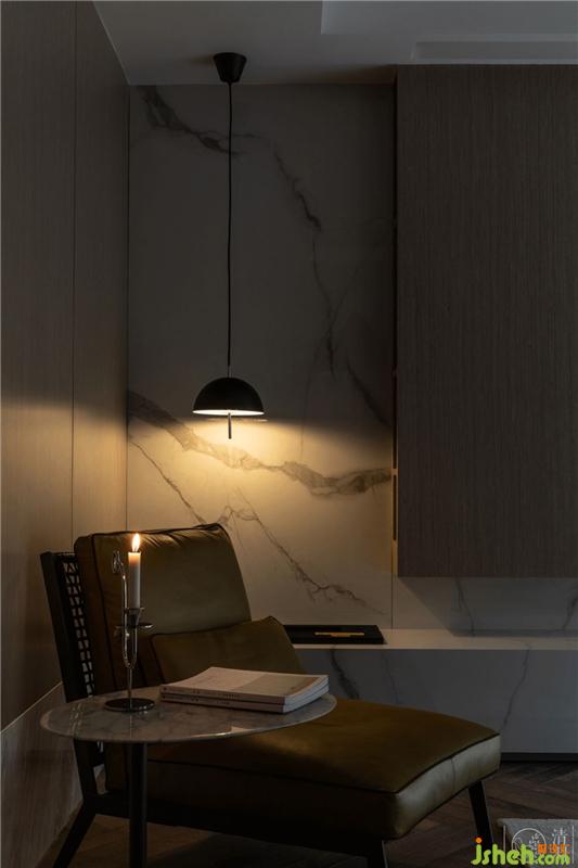 在沙發(fā)另一側對角,我們以線條簡潔著稱的瑞典Globen Lighting的吊燈與CAMERICH銳馳的休閑椅為重點做了一塊休閑閱讀區(qū)。CAMERICH銳馳的PEBBLE茶幾上放著限量款的Nagel無盡系列燭臺,我們想愜意、優(yōu)雅一定是這一塊設計的關鍵詞。