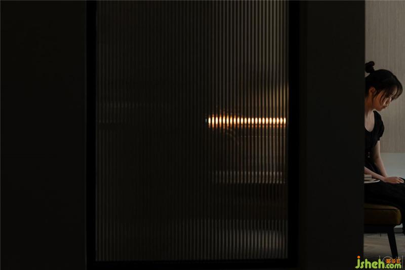 在這一塊區(qū)域的一墻之隔是一層的衛(wèi)生間,旁邊則是餐廳部分,我們借助原本的墻體,加入長虹玻璃同時也呼應入口處的設計也做了一個空間分隔裝置。室內設計師