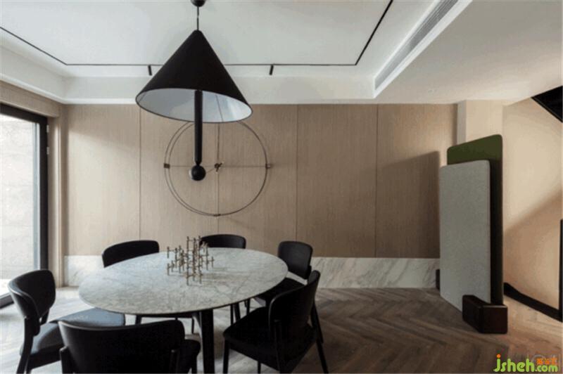 在餐廳上方裝置了一圈磁吸燈,安裝的射燈也可以隨意調(diào)節(jié)位置和角度。黑色的燈軌與Nomon掛鐘搭配起來也極其協(xié)調(diào)。