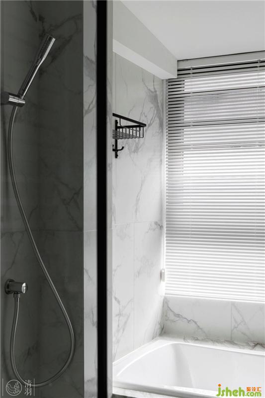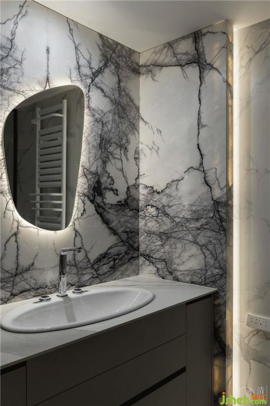 天然大理石背景墻、異形切割的鏡子,顏色清爽的百葉窗,搭配切割整齊的壁龕小空間也可以做出精致大氣的視覺(jué)感受??v向的嵌入式燈帶在夜晚還能給衛(wèi)生間平添一份夢(mèng)幻美感。