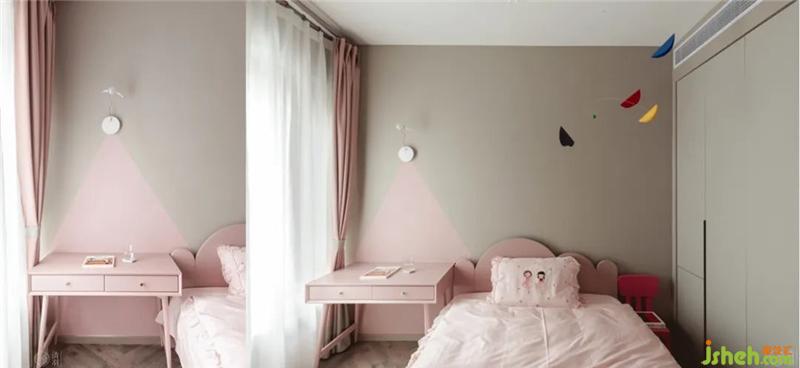 粉色云朵造型的床頭板連接著Lucellino壁燈下用粉色涂料描繪出的幾何投影,我們?cè)噲D讓少女心再輕盈一點(diǎn),就像飄在羽毛做成的云端。室內(nèi)設(shè)計(jì)師