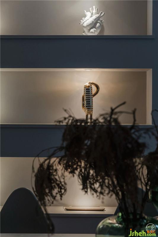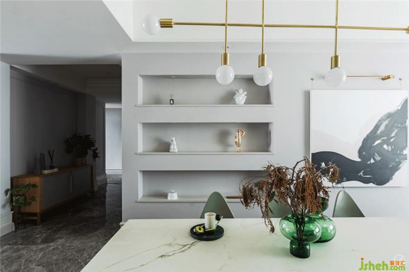 一面是利用原有結(jié)構(gòu)做的內(nèi)凹式造型,展示各種杯具;一面是定制的開放式櫥柜,魚肚白巖板搭配黑色柜門,雅致不俗,充沛的收納空間才會(huì)讓家井井有條,呈現(xiàn)出慵懶隨意的灑脫狀態(tài)。室內(nèi)設(shè)計(jì)師