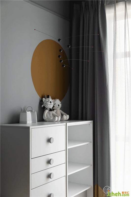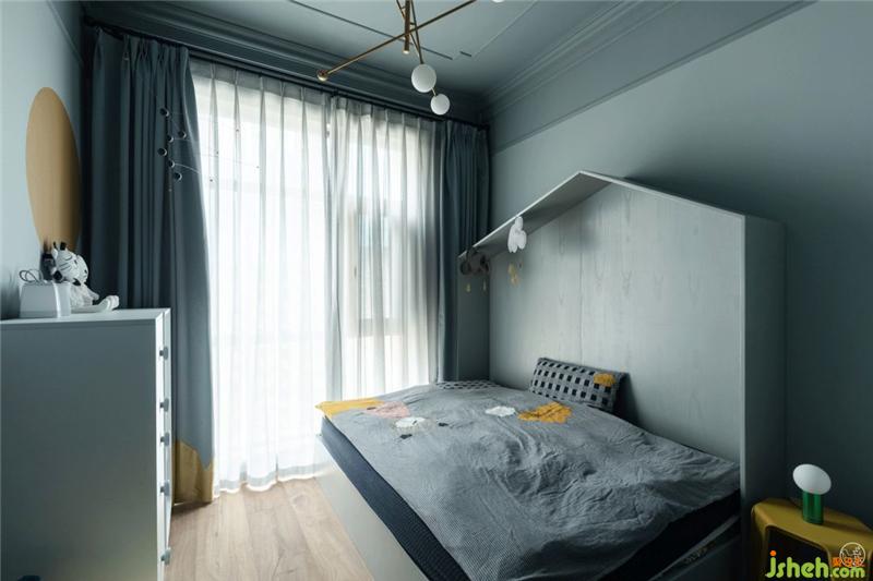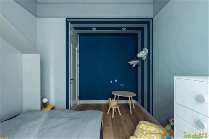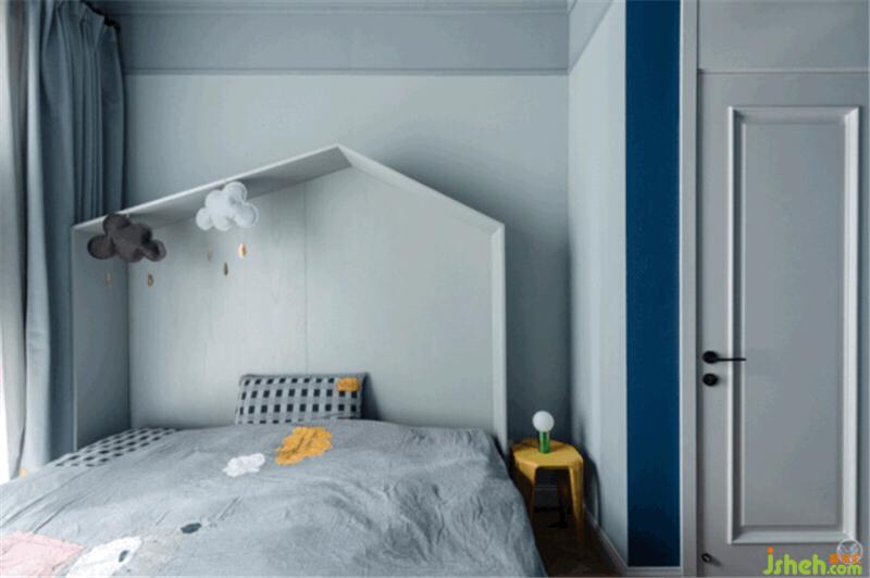 小男孩的房間像這個海洋般浪漫的家中的一座小島,奇趣而明快,基調(diào)依然是淺灰藍,頂面的藍又比墻面的藍稍深一度,窗簾的藍又比頂面深一度,小床房頂造型可愛又能讓孩子入睡時更有安全感。