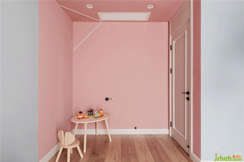 同樣呼應男孩房間,門后做了頂面墻面全粉色的設計,墻角的三角形線條光帶就像愛麗絲的兔子洞,望進去就是一個甜美的異想世界。室內(nèi)設計師