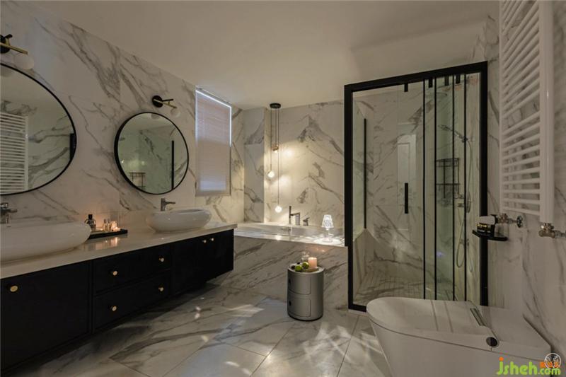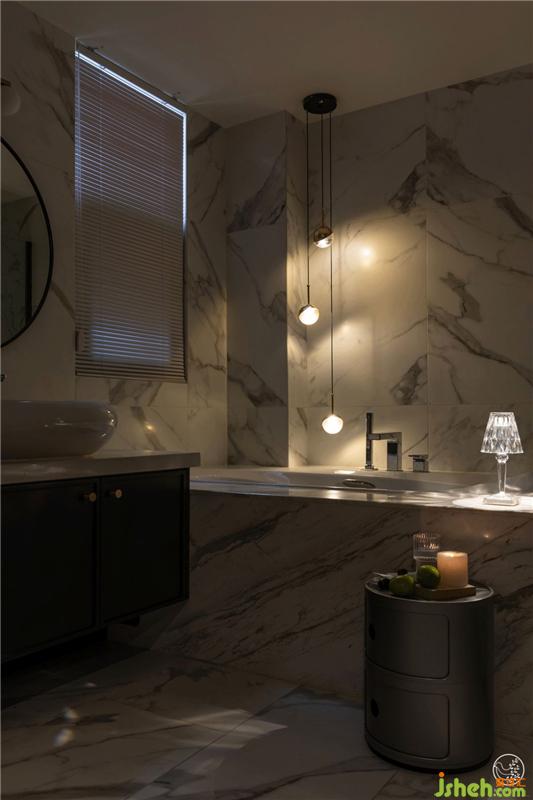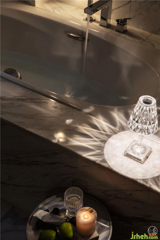 主衛(wèi)是潔凈夢(mèng)幻的卷云,墻面地面都是水墨般流動(dòng)的大理石紋,極具輕柔的整體感。浴缸墻角的圓形吊燈就像流星劃落,小巧復(fù)古的全水晶臺(tái)燈,點(diǎn)上香薰?fàn)T,陷入水的柔情和溫暖中,迎來一天最放松的時(shí)刻。室內(nèi)設(shè)計(jì)師