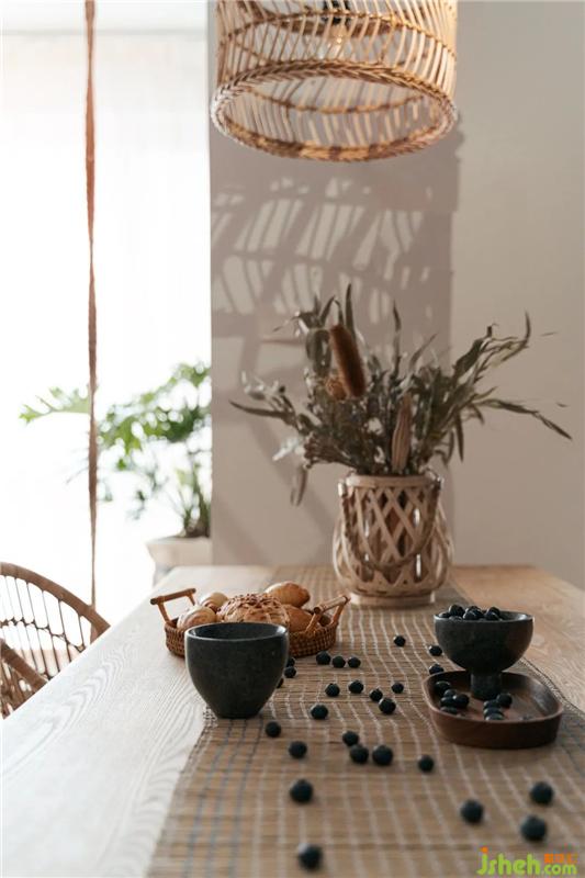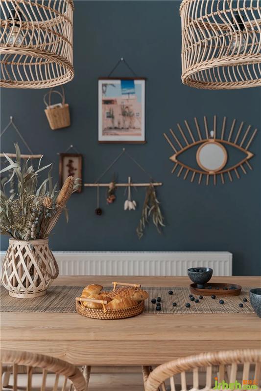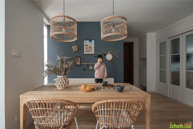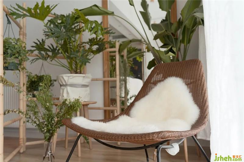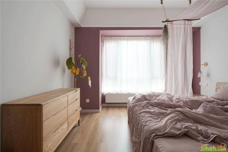 在主臥室中,我們偏向于joysnow本身對(duì)浪漫的追求和想象,采用了橡皮粉+白+原木的色調(diào)。