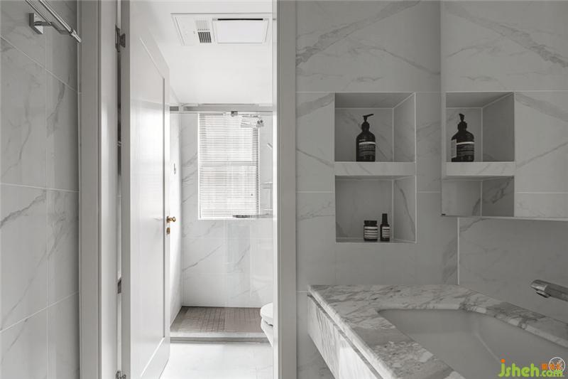 在淋浴間,我們采用粉色石材的地面,視覺上拉伸狹小的空間,浪漫的空間氛圍并帶有優(yōu)雅、高級(jí)質(zhì)感的空間躍然而出。室內(nèi)設(shè)計(jì)師