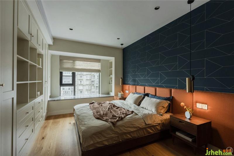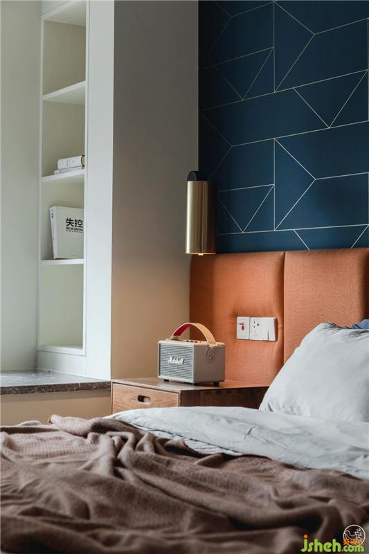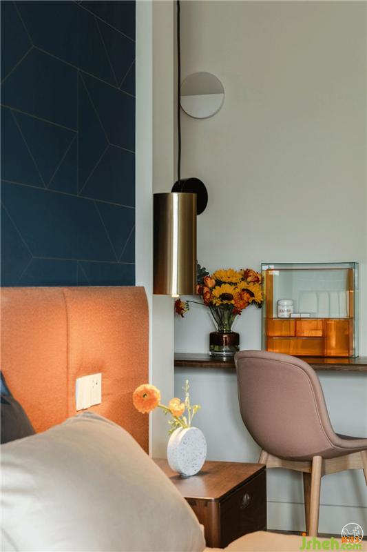 夫妻倆的臥室用了經(jīng)典的藍橙配色,偏深偏冷的藍平和了跳脫扎眼的橙,一半是海水,一半是火焰。