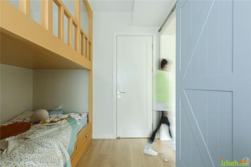 兒童房打通了兩個房間,但睡眠區(qū)與玩樂區(qū)又以谷倉門分隔,并且在門的兩面顏色上也做了不同深淺的處理,讓小朋友能安心睡,也敞開了玩兒。