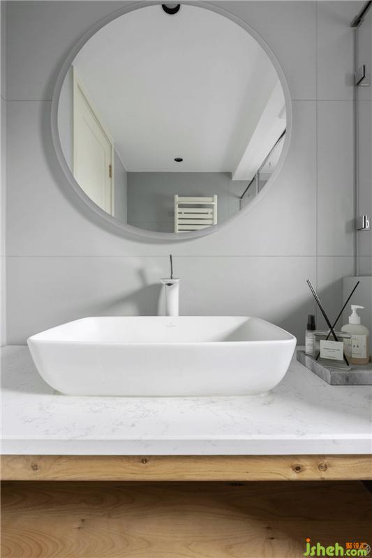 衛(wèi)生間的格局相對緊湊,通透、清爽的基調(diào)、清晰的布局能很好的弱化這一點。室內(nèi)設(shè)計師