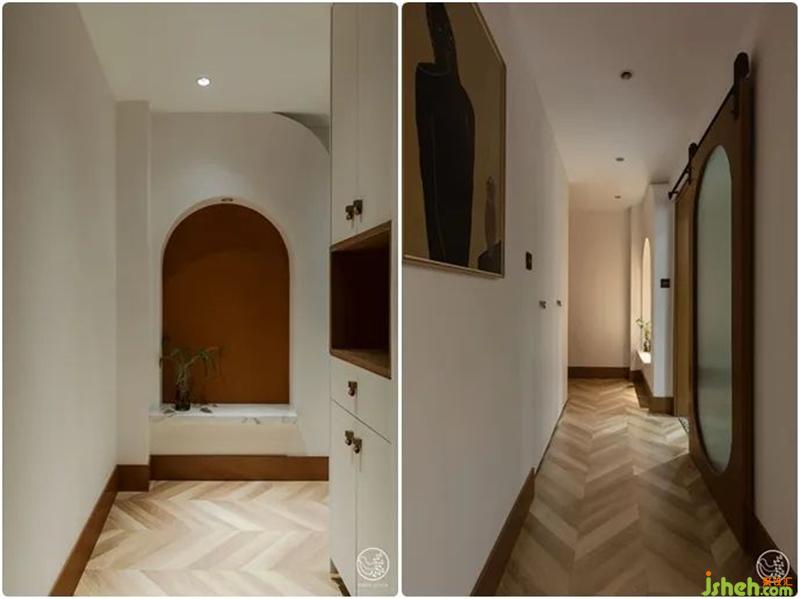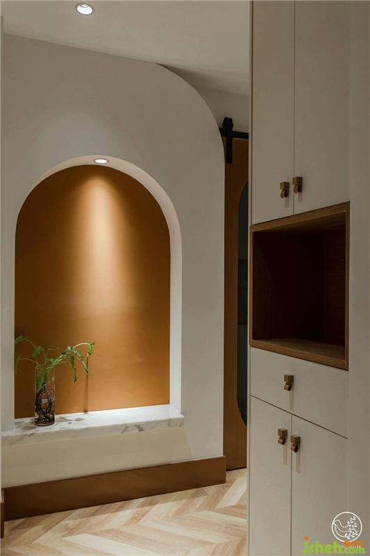 并借此與入戶后正對的廚房,形成了一條門廊。正對大門的墻面,因為轉角處剛好是水管所在,我們借機加厚部分墻體做了藝術處理,放大的拱形壁龕,臟橘色打底搭配大理石臺面,在白色墻面中跳脫出一絲異域風情。