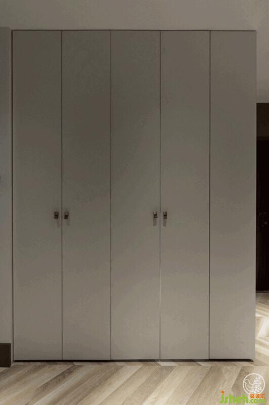 原始的空間戶型進門后有一塊相對方正的門廳,我們利用這個區(qū)域,以柜體代替墻體做了一個帶儲物功能的隱藏式生活陽臺。