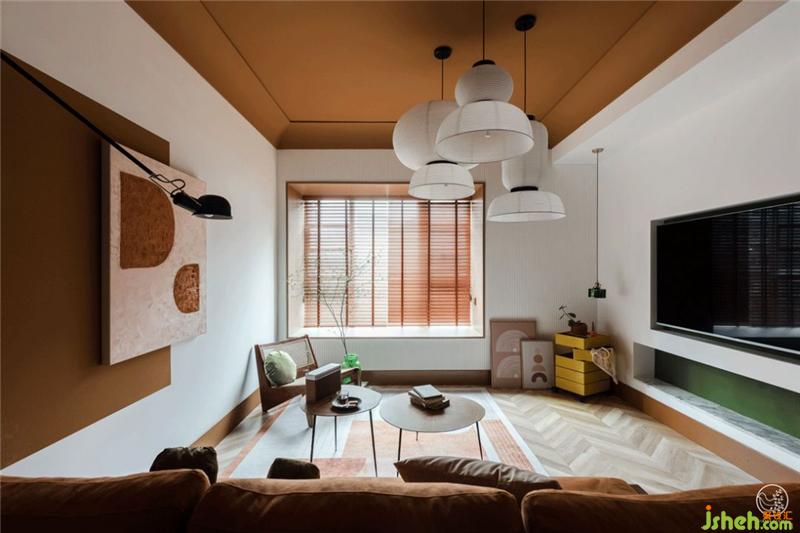 明快、元氣感十足的橙色,加入一定比例的棕色,忽然就沉穩(wěn)高級起來,對于口紅來說它反而變得沒那么“挑皮(膚色)”了,那么用在空間里會產什么樣的效應呢?是的,你猜對了,我們又一次做了大膽且自信的嘗試!大膽到“不管不顧”地用它涂滿了客廳的整個頂面,自信到帥氣地“忽視”了雪兒對于這個大手筆的擔心。畢竟五年內三次合作,這點心有靈犀還是在的。
