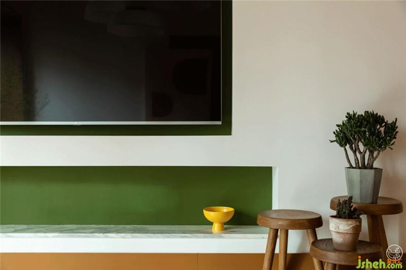 沙發(fā)、地毯、飄窗框等相對大面積的配色圍繞主色調展開,但通過電視墻下面的壁龕以及角落里Magis 360° Container局部的森林綠、檸檬黃跳色,恰如其分地強化空間的元氣感,同時避免輕浮與幼稚感。