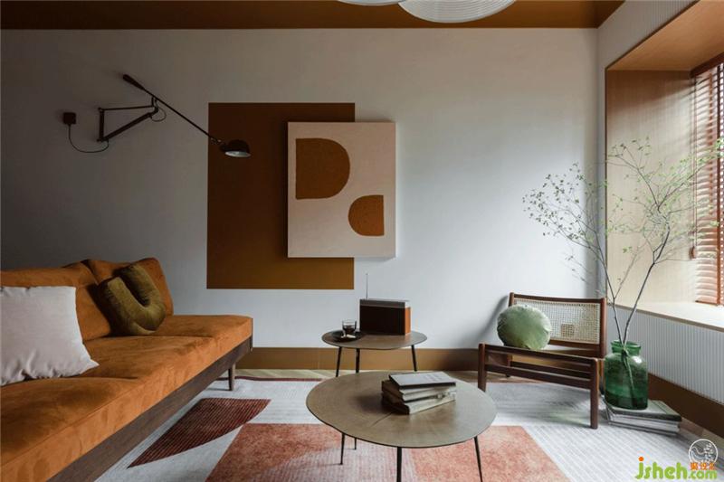 而在電視墻的對面,以簡單的臟橘色塊搭配手繪反色油畫構成空間視覺重點。輔以線條干凈的工業(yè)感壁燈,定幀出現(xiàn)代派抽象畫既視感。室內設計師