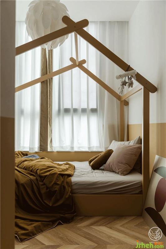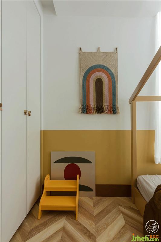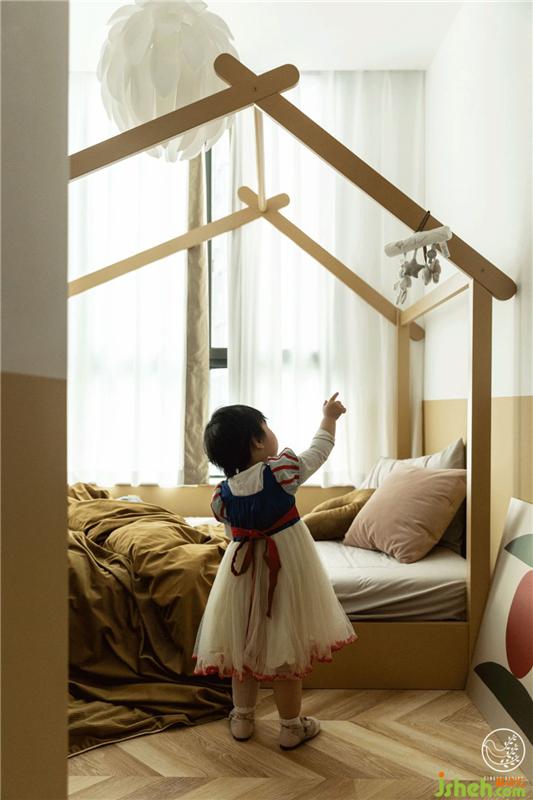 這里的小主人是一位可愛(ài)的小姑娘,我們?yōu)樗x擇了有生命力的黃色作為空間色彩。定制了童話里才會(huì)出現(xiàn)的木屋框架床,那些未加修飾的床框就留給小公主日后去裝點(diǎn)成夢(mèng)想里的模樣吧。