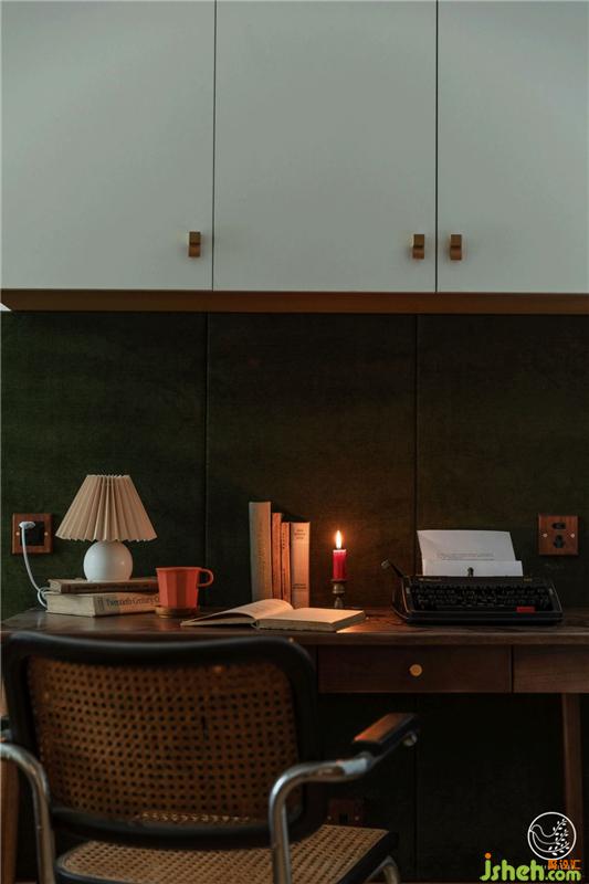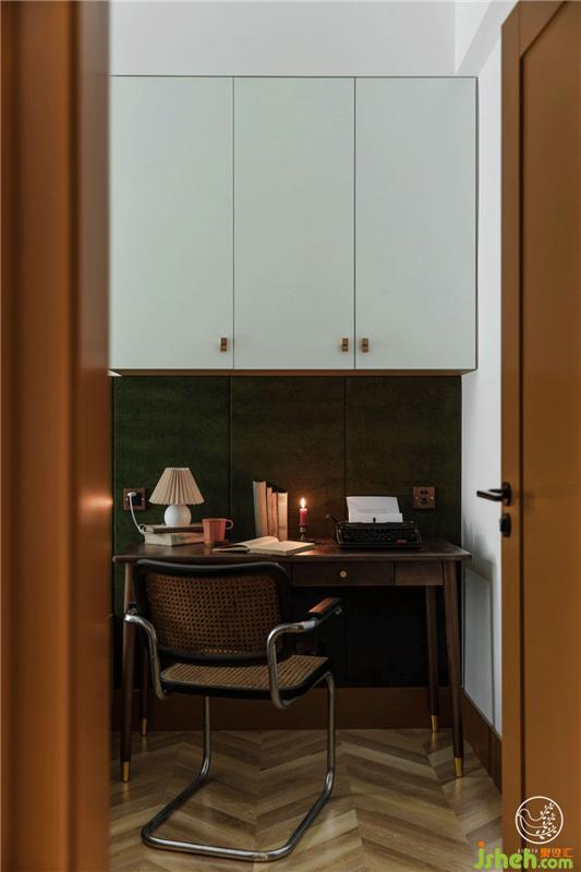 我們以復古綠乳膠漆搭配同色復古綠絲絨硬包,搭配茶褐色,視覺上劃分出休息與書寫區(qū),有意打造出速寫手稿般的歐洲中世紀書房既視感,收了一把Thonet中古懸臂椅是全屋最貴的家具,青春就是這樣任性。