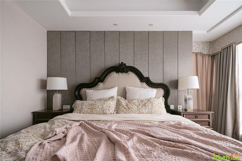 夫妻倆的臥室用了經(jīng)典的卡其色系色搭配深色的木質(zhì)美式床,顏色很好地相互襯托。