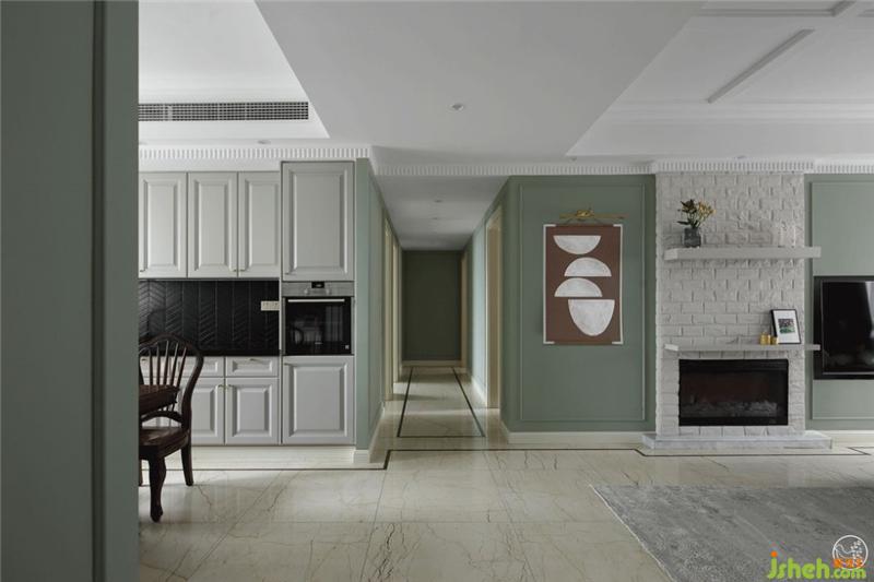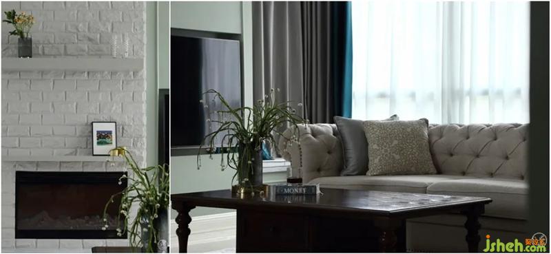 因為Joan不期望將電視掛在壁爐之上,于是我們打破常規(guī),以綠豆灰與白色從視覺及功能上分隔開了電視墻與壁爐。而銀灰色的窗簾,則在壁爐映出溫暖火光時,將原本清新、輕盈的氛圍承托出溫暖的歸宿感。