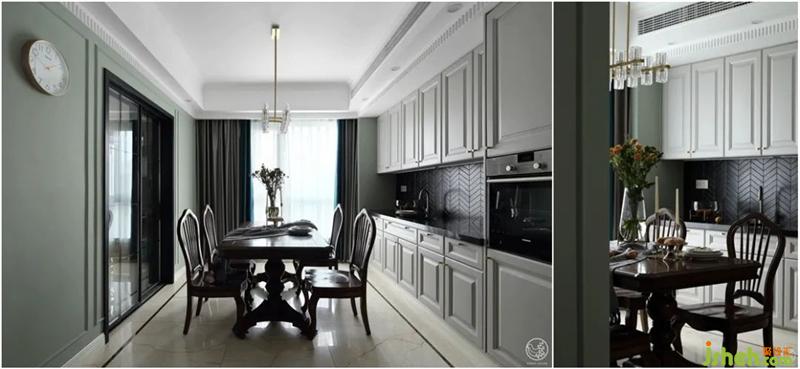 客廳與餐廳相連,相較于客廳整體偏輕盈的色彩基調(diào),餐廳在延續(xù)的基礎(chǔ)上,搭配了黑色人字形瓷磚以及深色的餐桌,讓整個空間顯得更為協(xié)調(diào)飽滿。室內(nèi)設(shè)計師