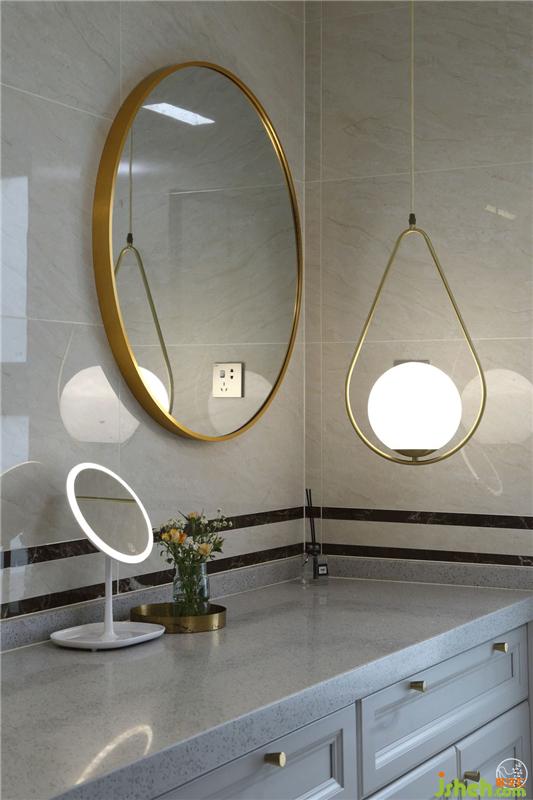 主衛(wèi)與次衛(wèi)色調(diào)相近,但是風(fēng)格卻大相徑庭,主衛(wèi)用白色紋路大理石搭配上黃銅的幾何燈與圓形鏡面,描繪出雅致的家庭生活情景。