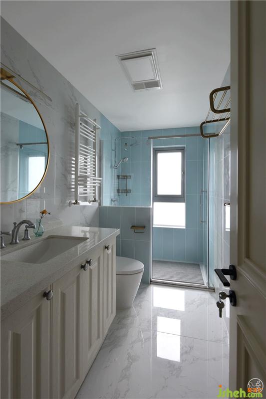 次衛(wèi)則不同,在大面積的白色大理石紋瓷磚中插入淺藍(lán)色瓷磚,清新典雅,又略顯俏皮。室內(nèi)設(shè)計(jì)師