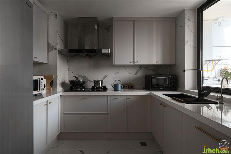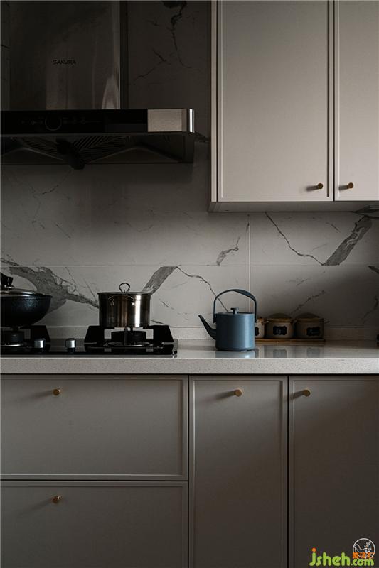 在擴(kuò)寬了原始廚房面積之后,廚房與生活陽(yáng)臺(tái)以窗相連,功能布局合理清晰。墻面和地面延續(xù)了客餐廳大理石花紋的材質(zhì),讓內(nèi)外空間高度統(tǒng)一,為Gemini營(yíng)造了舒適、合理的操作環(huán)境。