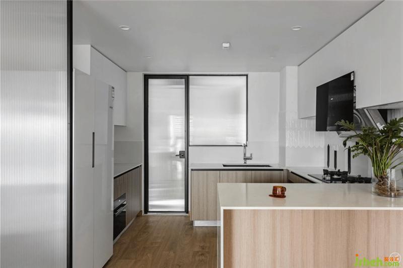 為了讓整個(gè)空間足夠的連貫,我們繼續(xù)拆除了原本廚房與客廳之間的隔斷墻,進(jìn)而做了很窄且精致的一扇磨砂玻璃隔斷,黑色邊框,讓冰箱放置在此處不不會(huì)顯得突兀,也延續(xù)整個(gè)廳堂的節(jié)奏感。