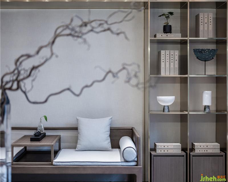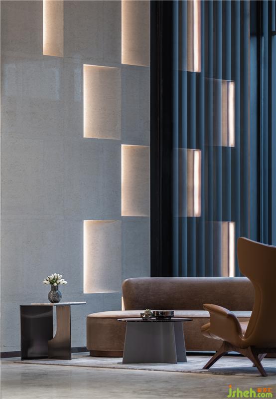 進入地下一層會所大廳,東西兩側(cè)的庭院與中心的隔斷及樓梯內(nèi)外呼應(yīng),展示出自然與空間的互動,配合到頂?shù)难b飾置物架隔斷,整個接待空間顯得沉靜而脫俗,低調(diào)而精致。會所設(shè)計