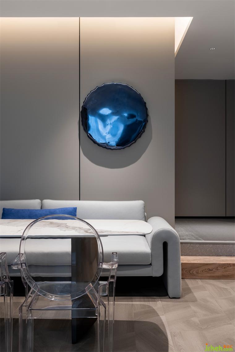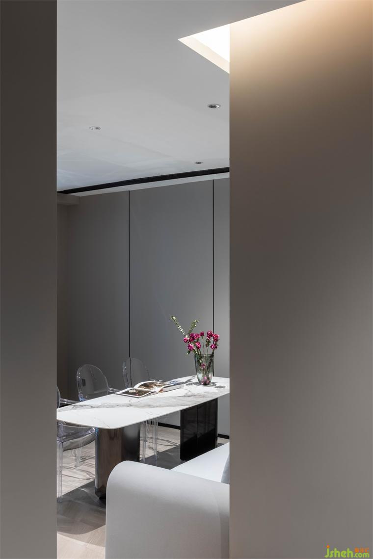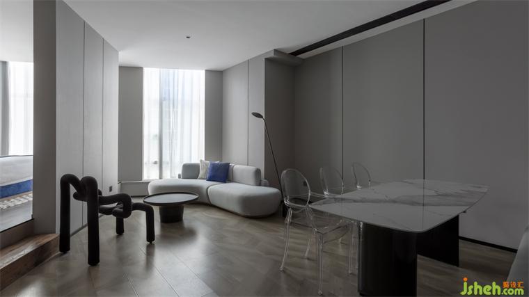 影青延續(xù)了傳統(tǒng)青色體系,酒店設(shè)計以青紫色作為空間的基礎(chǔ)配色調(diào)性。從墻面到落地的木質(zhì)板塊碳塑地板,低飽和度的淺灰色墻面護墻板,內(nèi)里環(huán)環(huán)相扣,起承轉(zhuǎn)折處,整體空間呈現(xiàn)雅致美感。