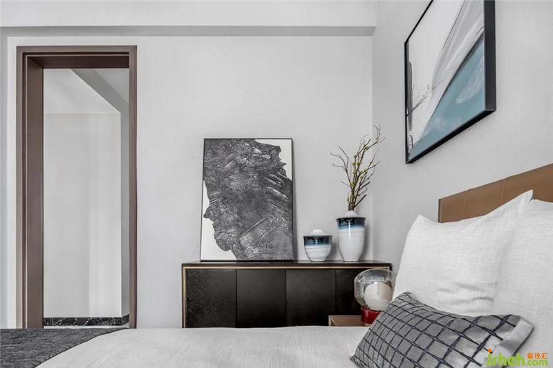 主臥墻面以中性灰為基調(diào),呈現(xiàn)簡單而純粹的空間感。銅色的裝飾,使內(nèi)部空間簡約不失時尚感。抽象的藝術(shù)掛畫,和床件的搭配分外和諧,精致感油然而生,彰顯出壹種對精致生活的美好向往,隨身處喧囂城市,卻能擁有片刻寧靜。
