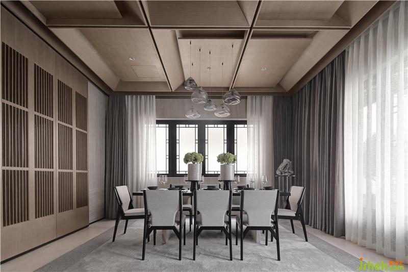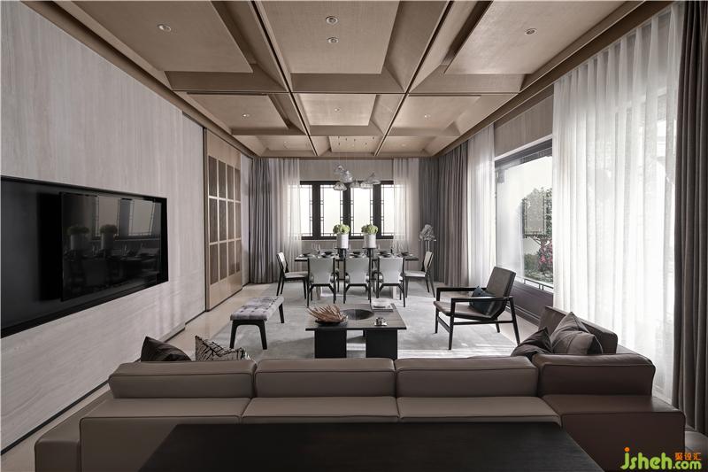 室內(nèi)公區(qū)天花提煉中式梁架結(jié)構(gòu)和坡屋結(jié)構(gòu),將其簡化為經(jīng)典九宮格木構(gòu)造型,用現(xiàn)代手法演繹中式韻味,天花與墻面在色調(diào)上的呼應(yīng)統(tǒng)一,強(qiáng)化了空間在視覺上的延伸感。一層作為生活起居空間,樣板房設(shè)計(jì)將客餐廳與室外完全打開,將更多的自然景觀引入室內(nèi),模糊室內(nèi)與室外、建筑與自然、人與自然的邊界,交互形成,渾然共生。