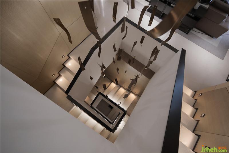 樓梯燈光設(shè)計(jì)選擇了更為人性化的點(diǎn)光源,從墻面透光到步梯,均勻分布,光感溫和、溫馨。一條以銅片為素材的手工藝術(shù)裝置輕盈如飄帶,貫穿別墅四層的樓梯天井。幾何硬朗與靈動(dòng)輕盈,形成對(duì)比反差,也讓空間生動(dòng)起來。