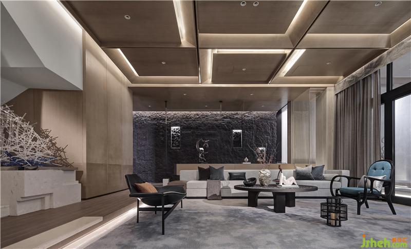 飲茶在嶺南文化中占有重要的一席之地,茶室意境與書房不同,更具傳統(tǒng)意韻。樣板房設計黃銅鑄造的吊燈如荷葉自然寫意,主人椅點亮主旨,客凳則由鉑晶樹脂與原木融合,東西交融意味十足。